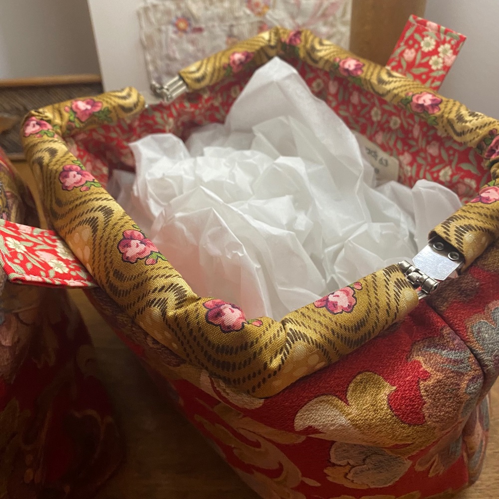 Trousse réalisée en tissus anciens et vintage, à fermoir métallique clic-clac.