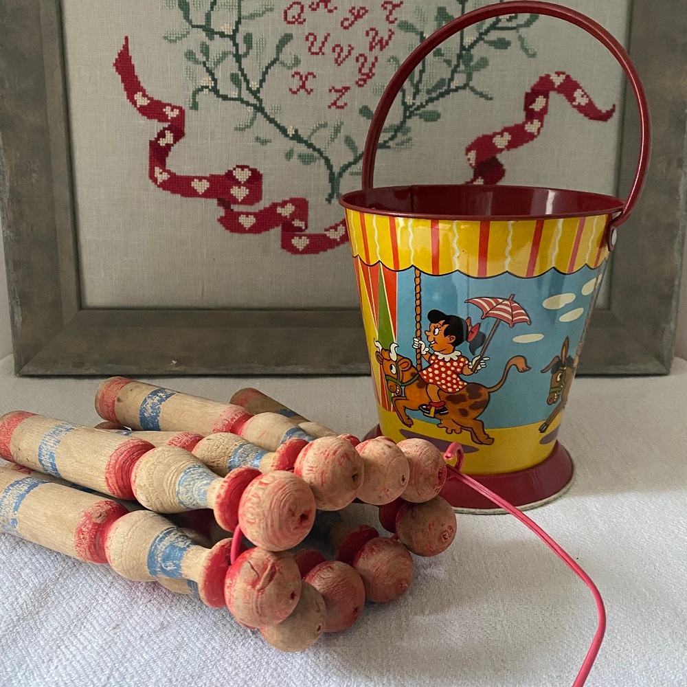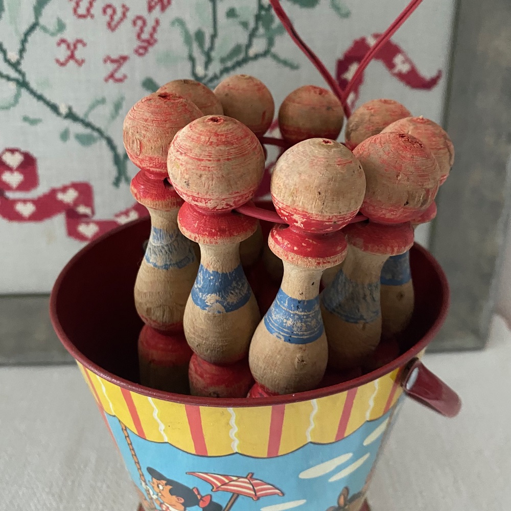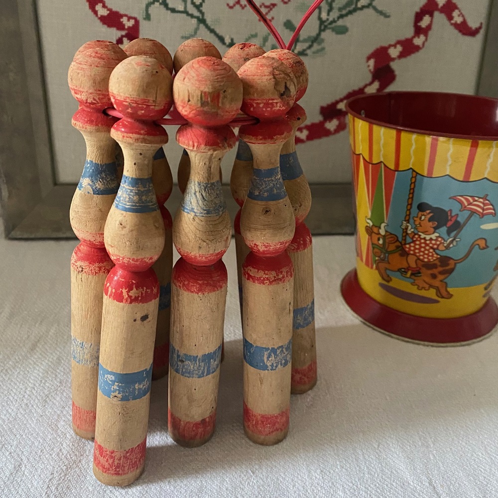 Jeu de quilles ancien, bois peint patiné par le temps.