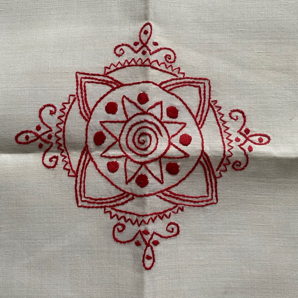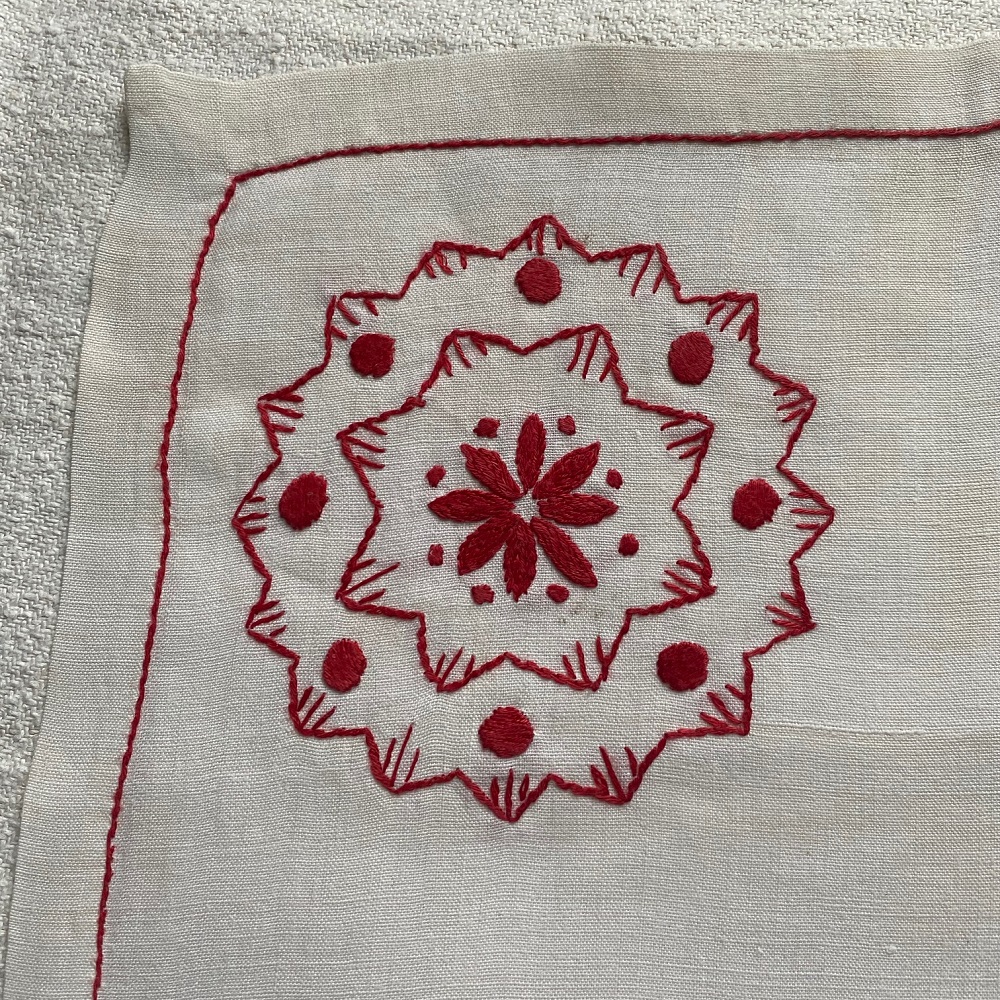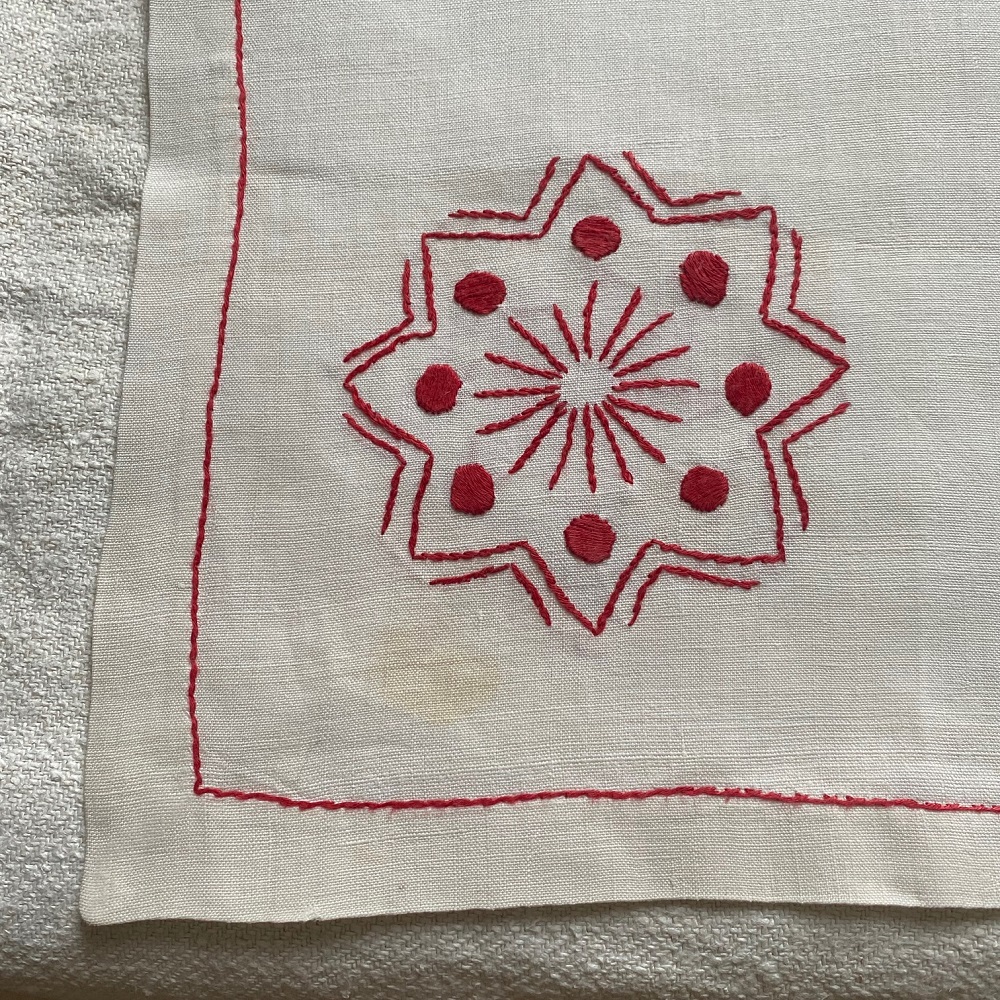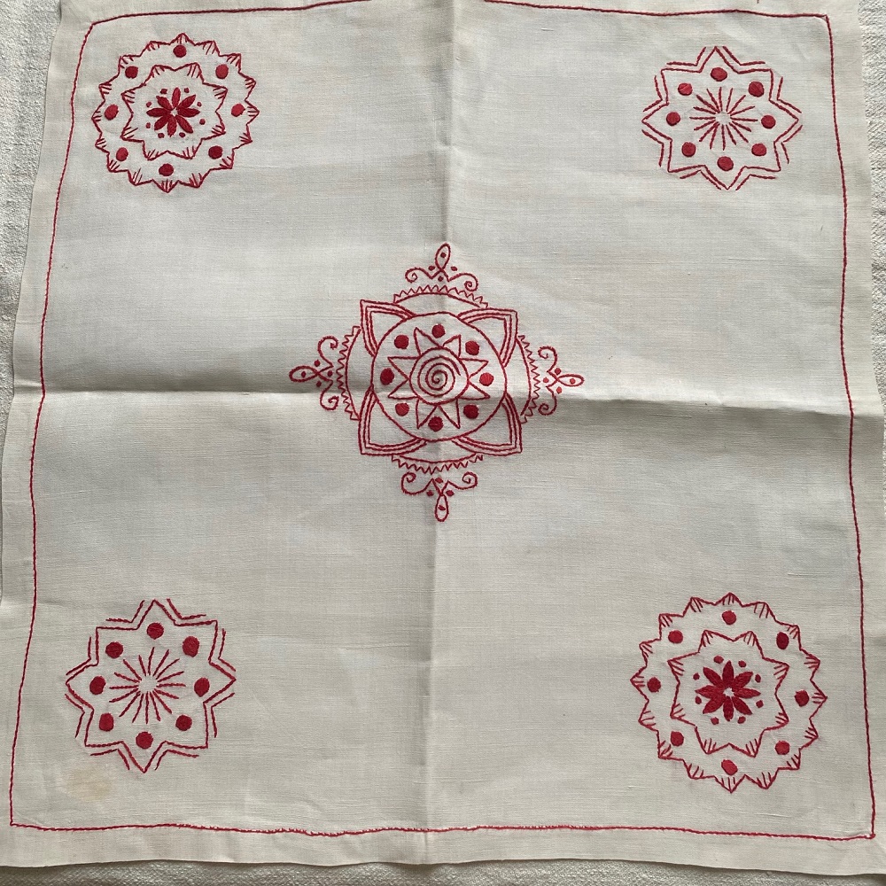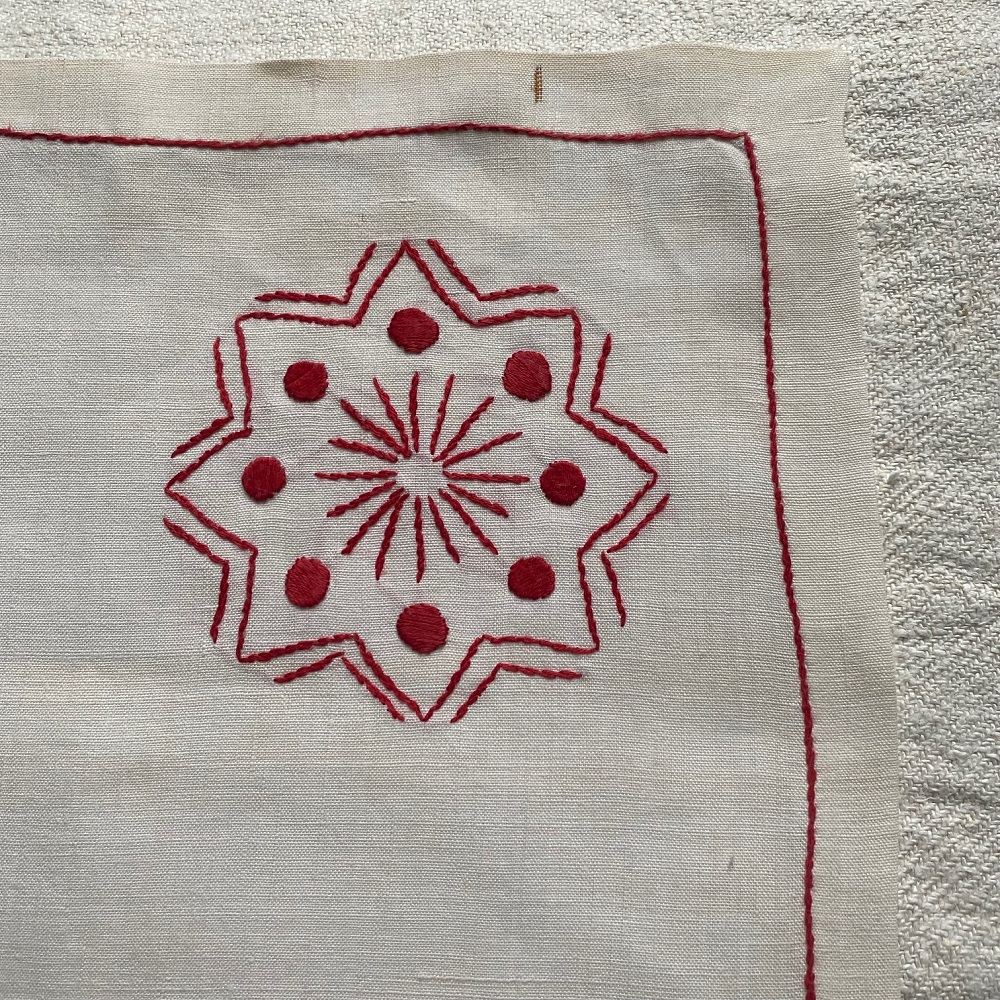 Grand napperon blanc en fil, broderie rouge, 5 motifs étoilés.