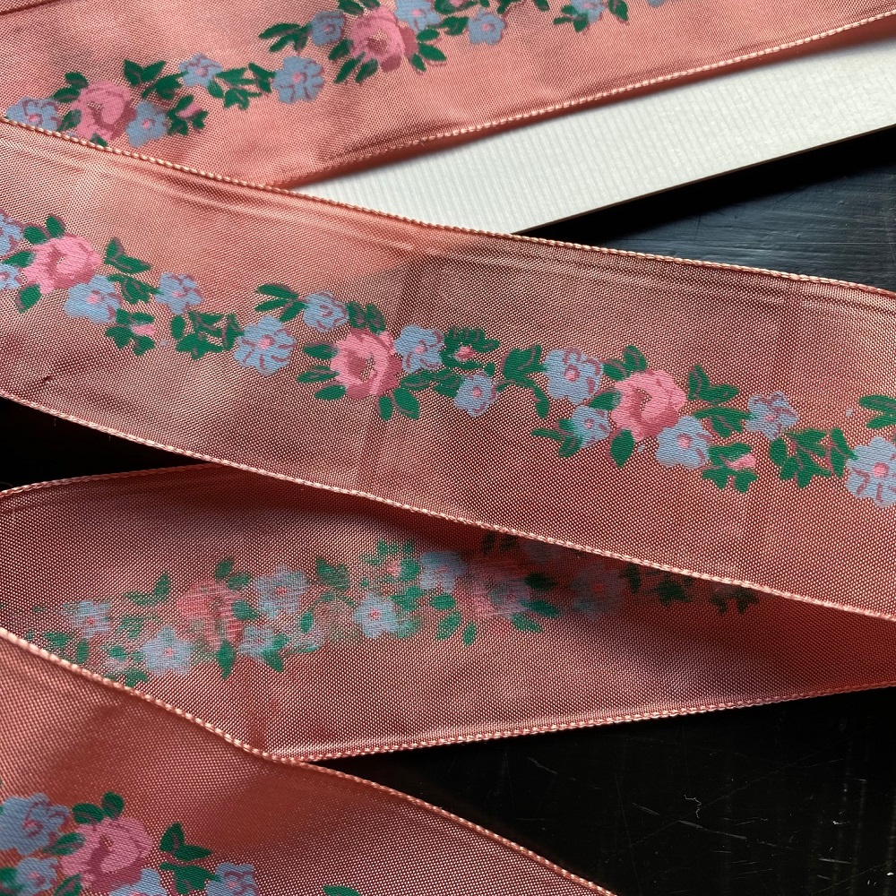 Charmant galon satiné rose blush orné de fleurs peintes.