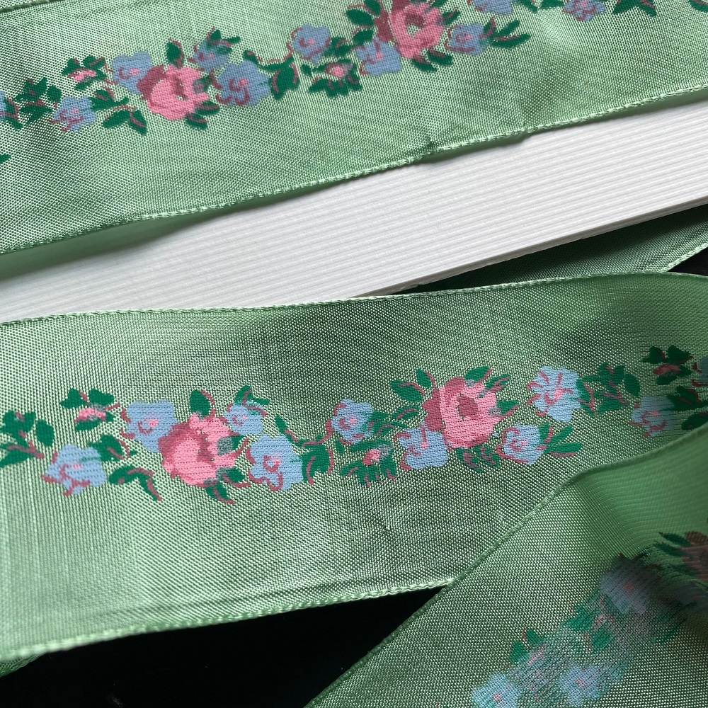 Charmant galon satiné vert orné de fleurs peintes.