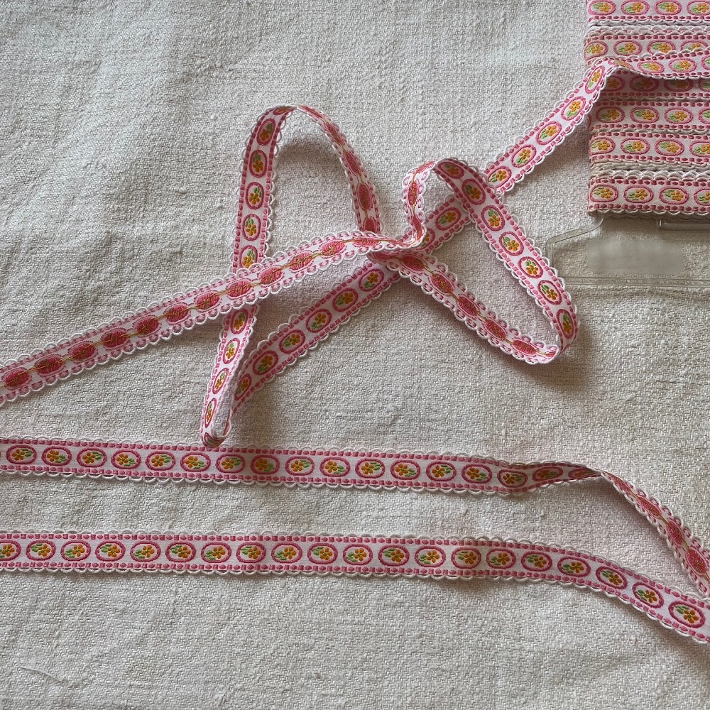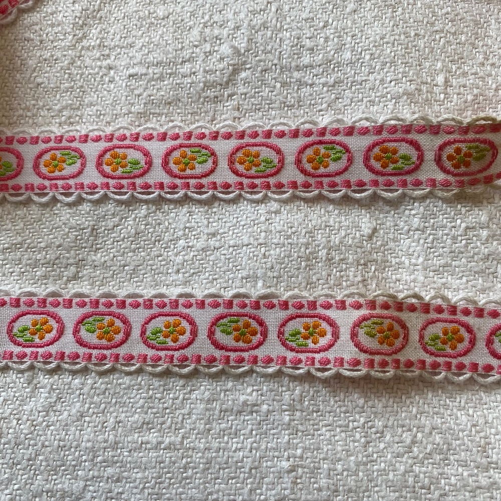 Galon vintage, blanc festonné à petits médaillons fleuris.