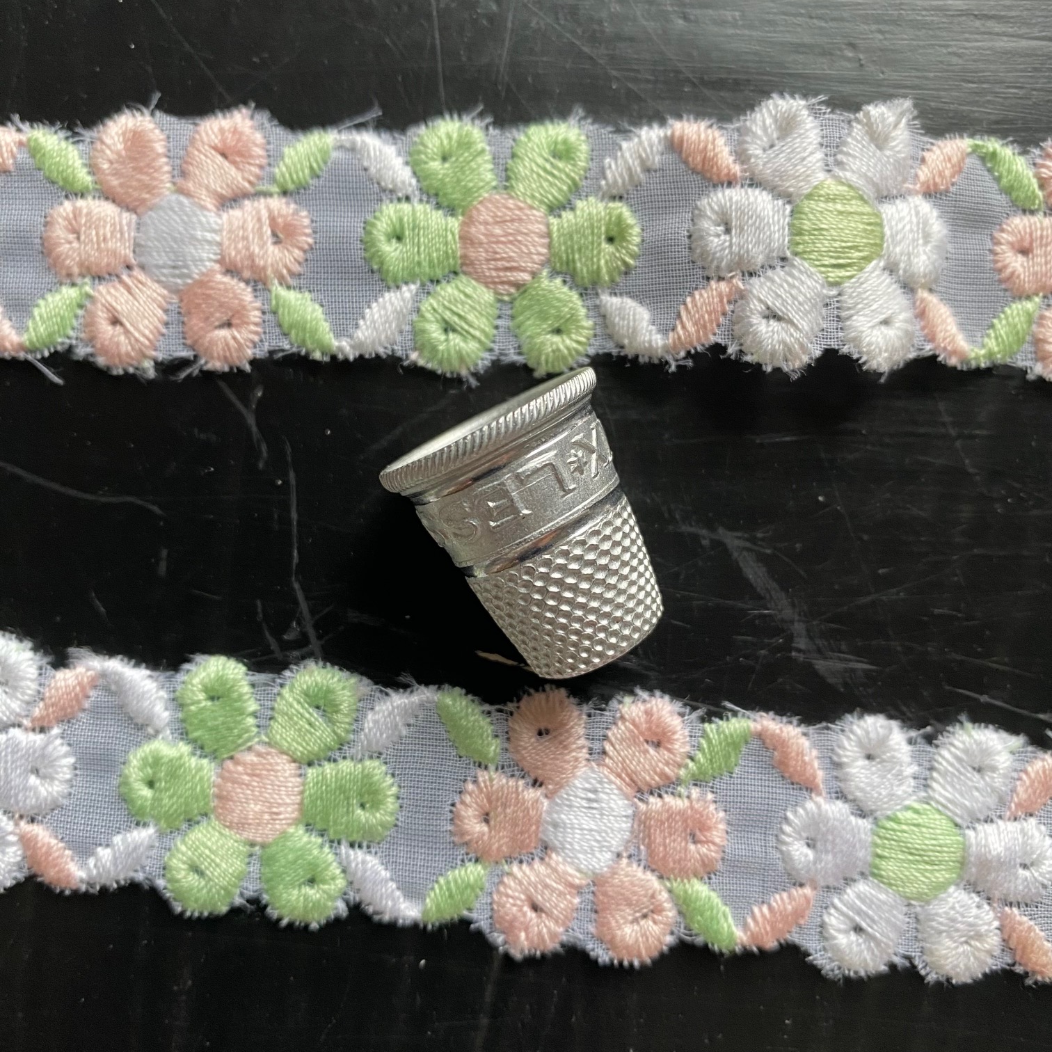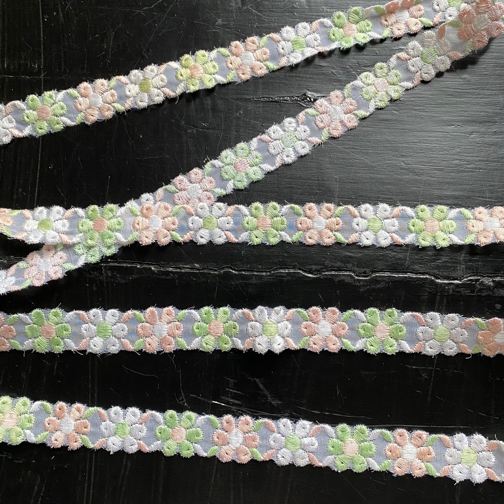 Ruban vintage, composé de fleurs brodées sur gaze transparente. Fleurs blanches, roses, vertes.