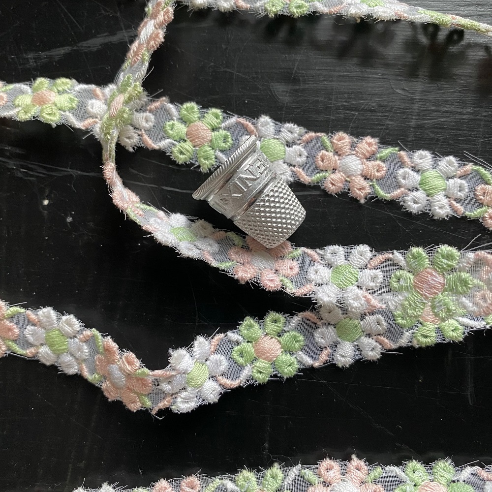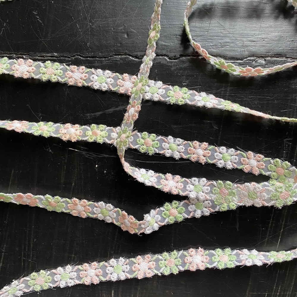 Ruban vintage, composé de fleurs brodées sur gaze transparente. Fleurs blanches, roses, vertes.