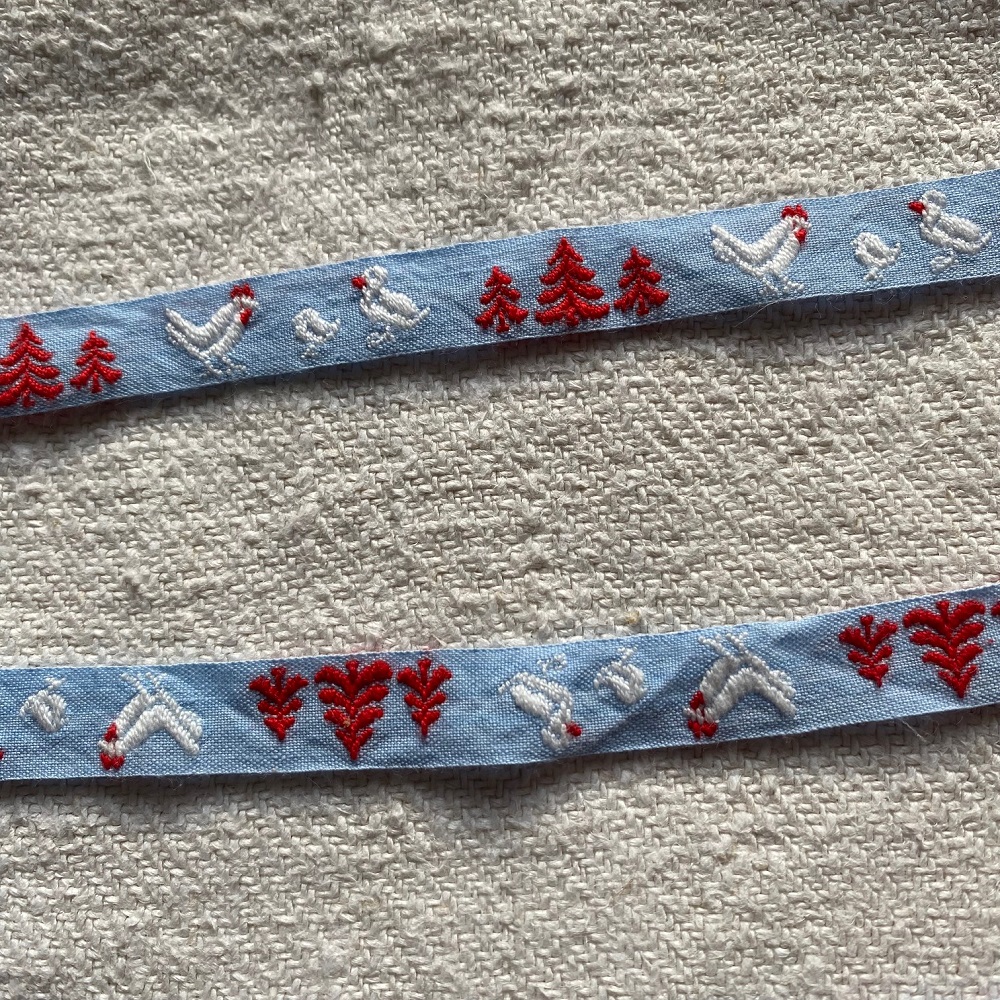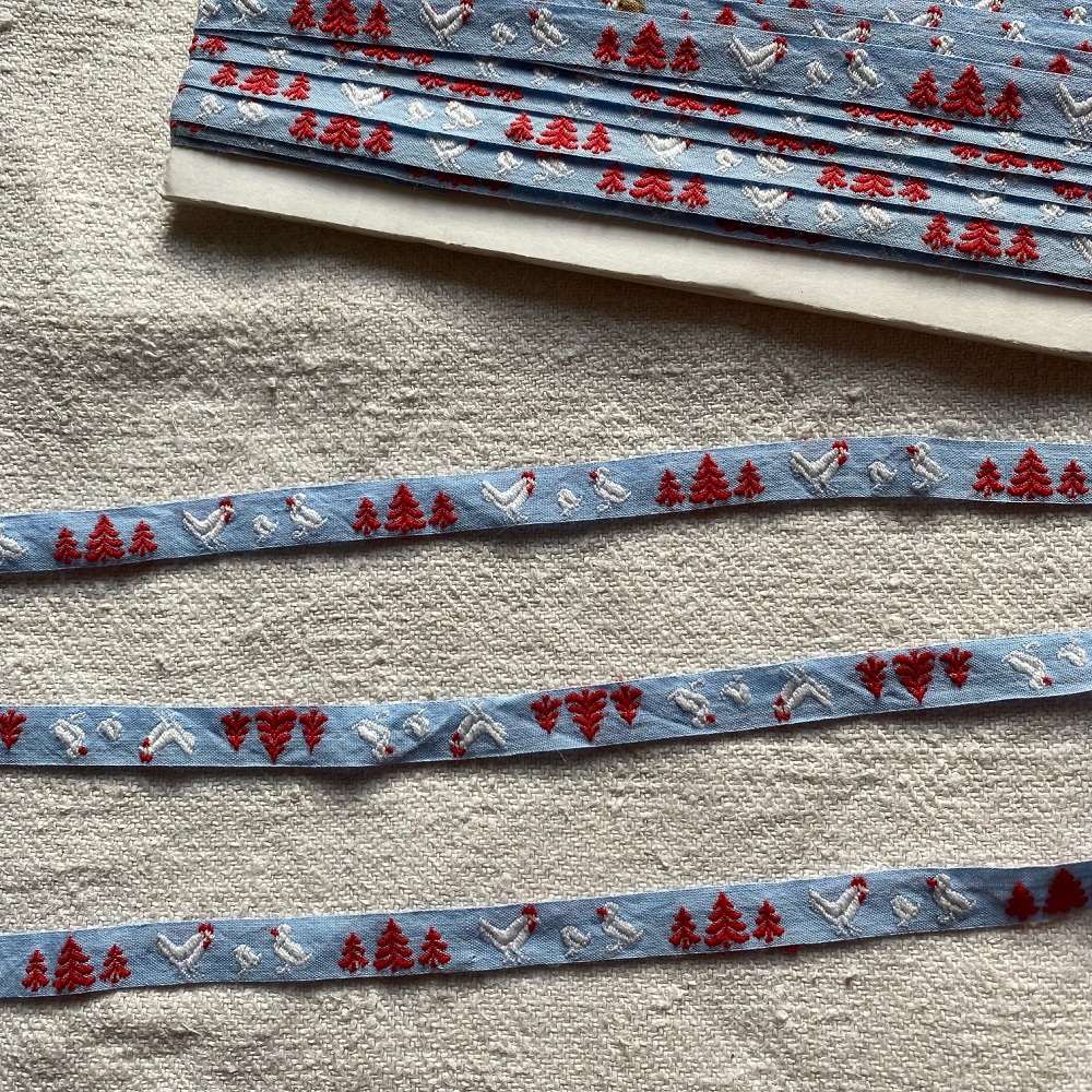 Galon ancien, fond bleu ciel, motifs de poussins, coq, canard et sapins, tons rouges et blancs.