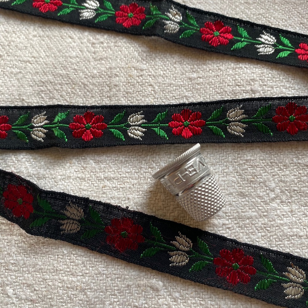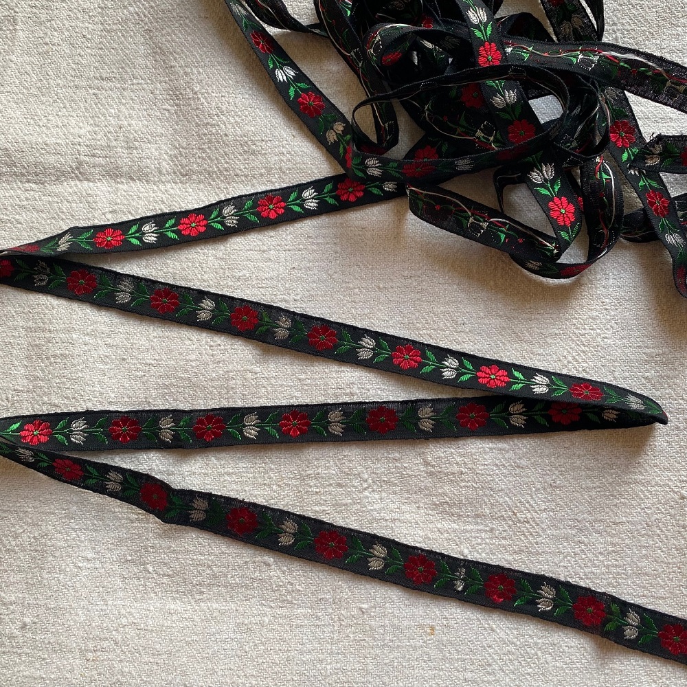 Ruban ancien, fond noir , motif fleuri de tulipes blanches et fleurs rouges.