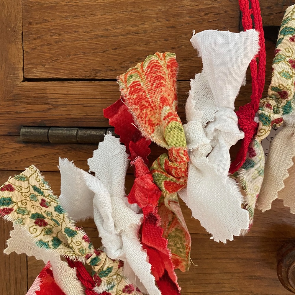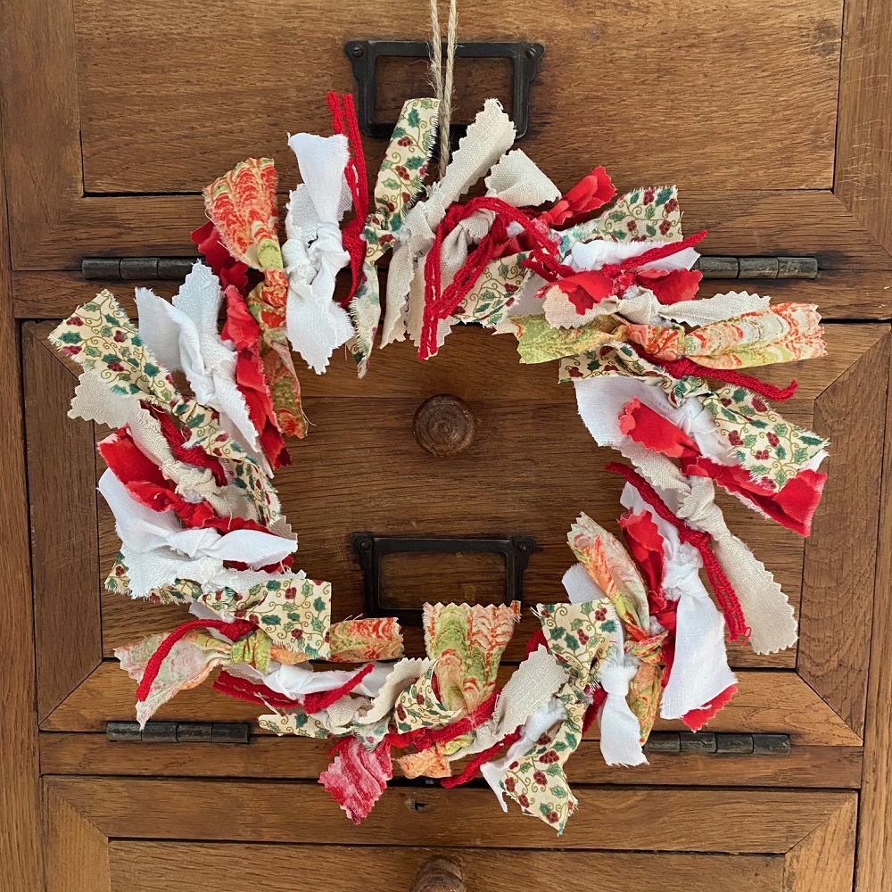 Couronne réalisée sur armature métallique, remplie de petits nœuds de tissus et dentelles vintage et anciens.