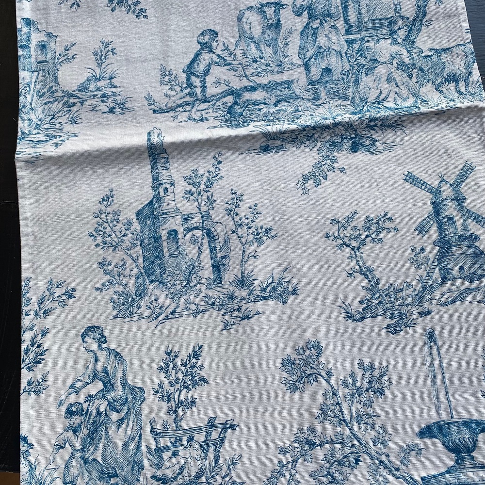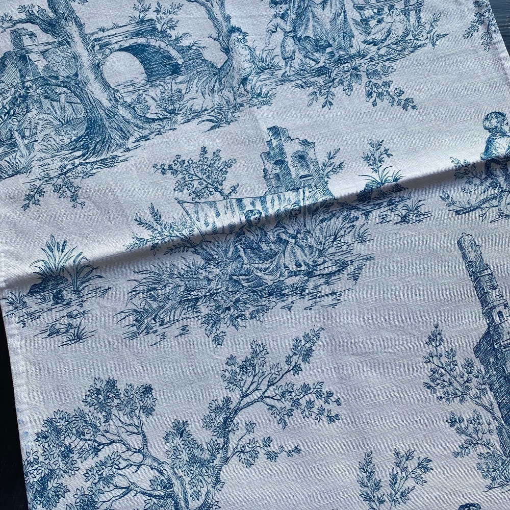 Coton Marignan ancien, fond clair à motifs bleu cyan, style Jouy 19ème.