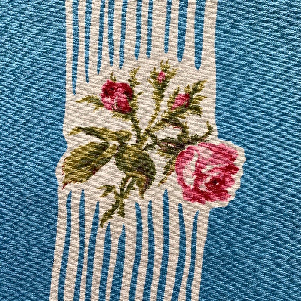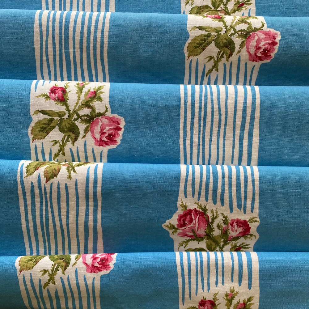 Très beau coton 1950, Romanex de Boussac, au fond bleu azur et aux larges rayures ponctuées de roses moussues.