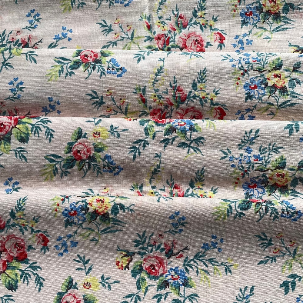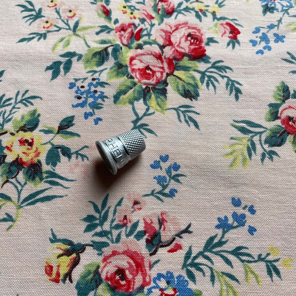 Coupon de coton ancien, fond rose à bouquets multicolores.