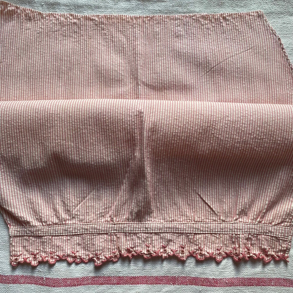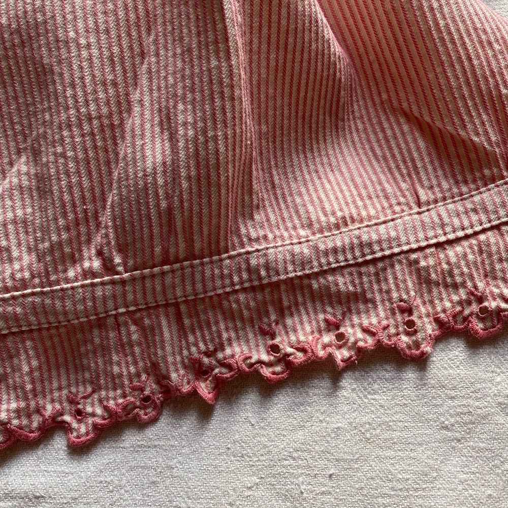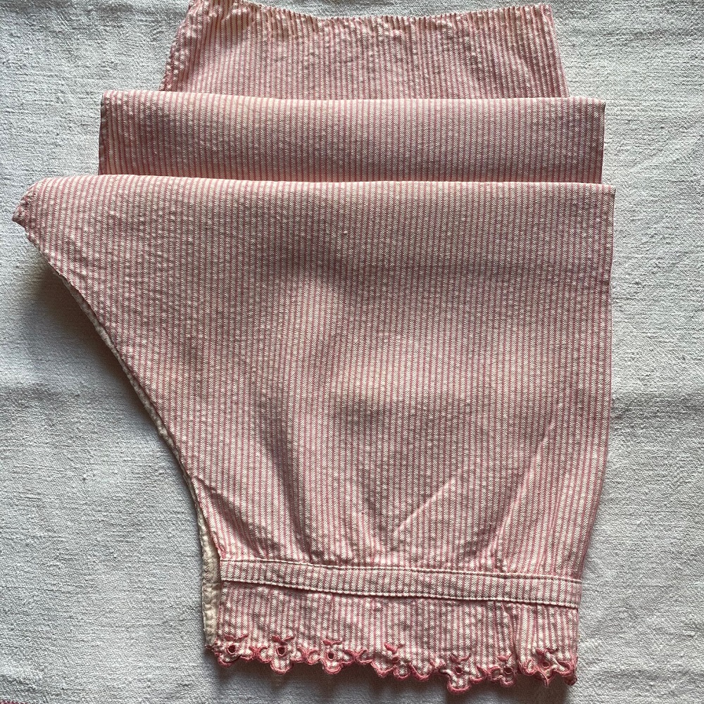 Demi culotte fendue, ancienne évidemment, en finette rayée crème et rose, joli feston brodé en bas.