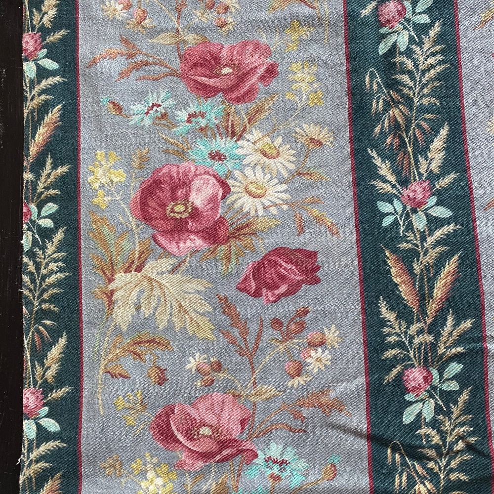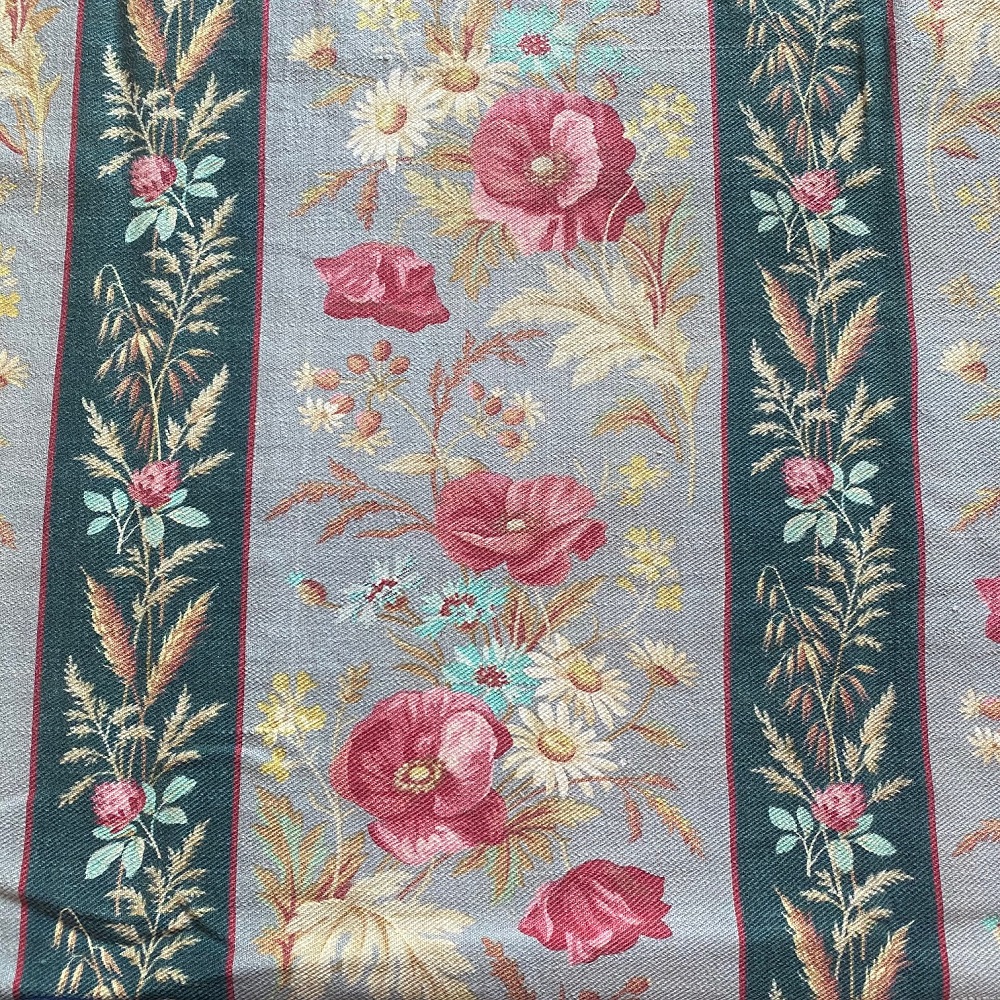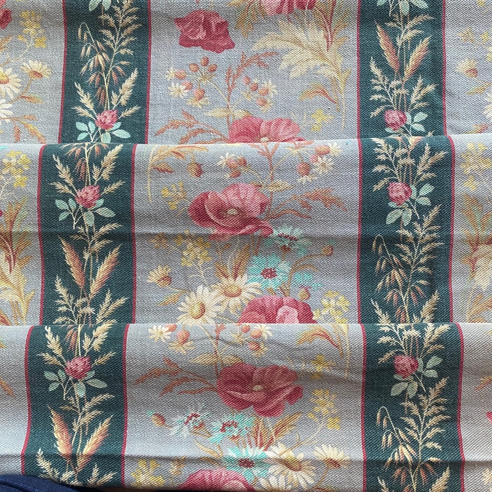 Très beau tissu époque Napoléon III, larges bandes fleuries de coquelicots, bleuets, marguerites, étroites bandes fleuries de trèfles, millets et blés.