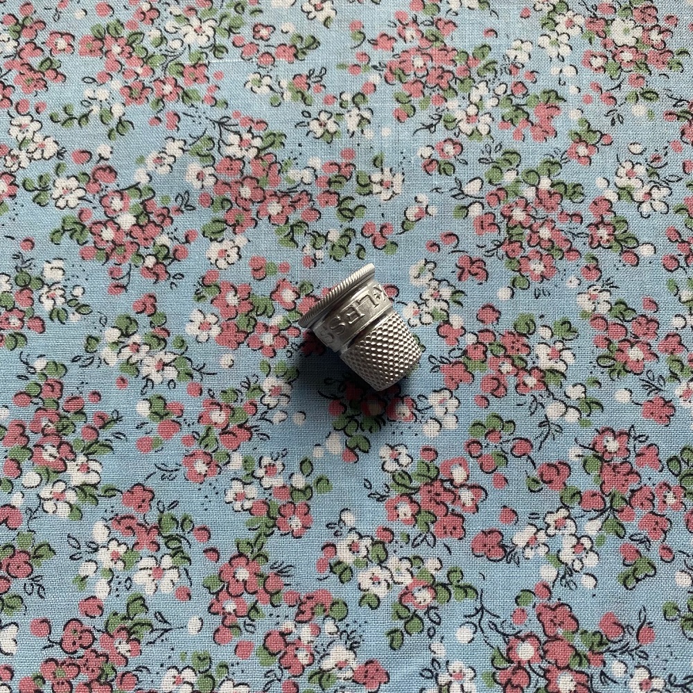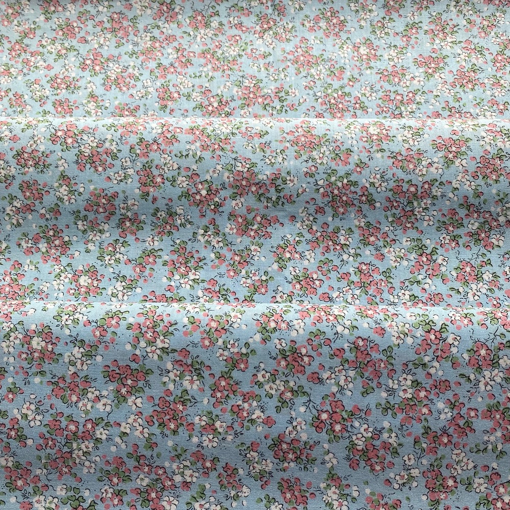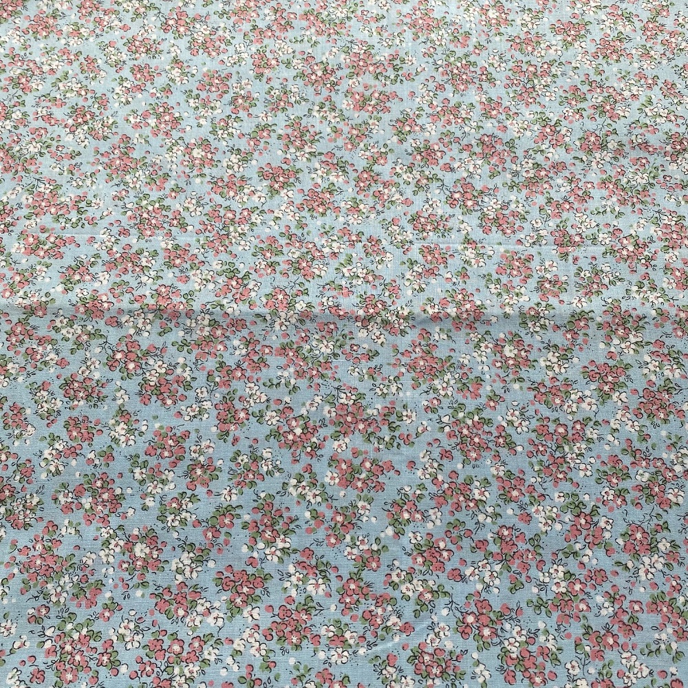 Coton ancien, fond bleu et impression de brouillard fleuri.