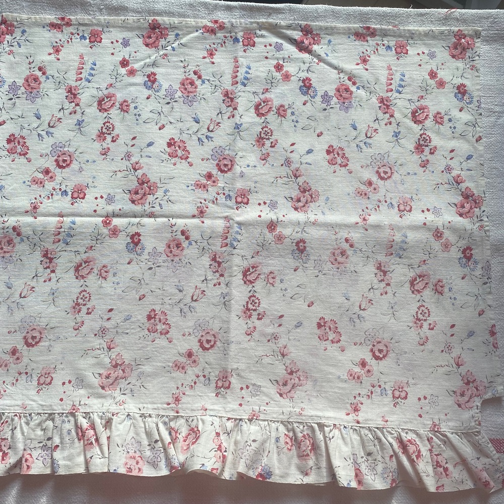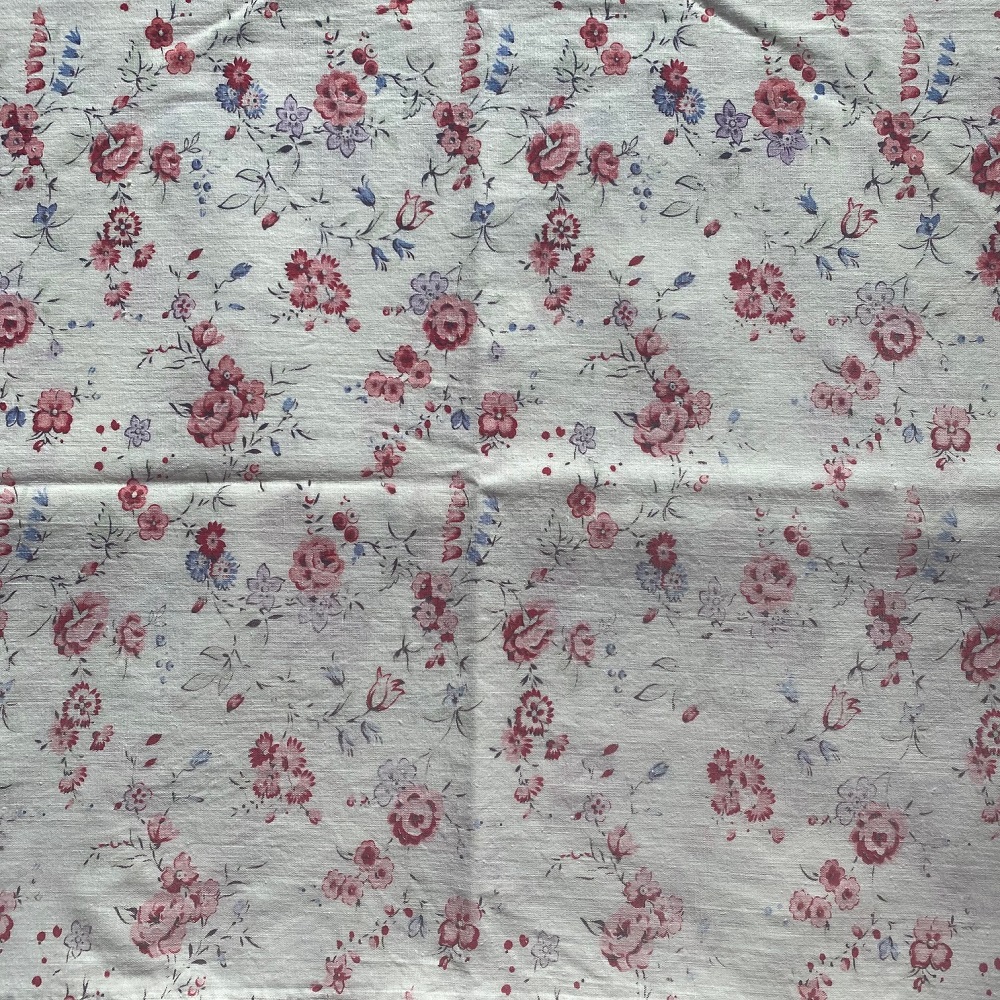 Coton ancien, motif fleuri très doux, fané dans la partie basse, près du bas froncé.