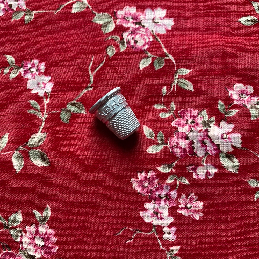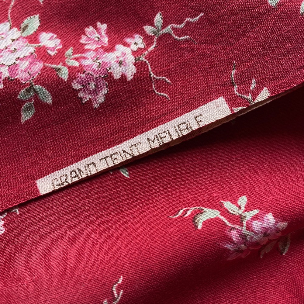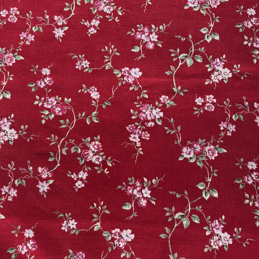 Coton ancien, fond rouge profond, à petites guirlandes florales.