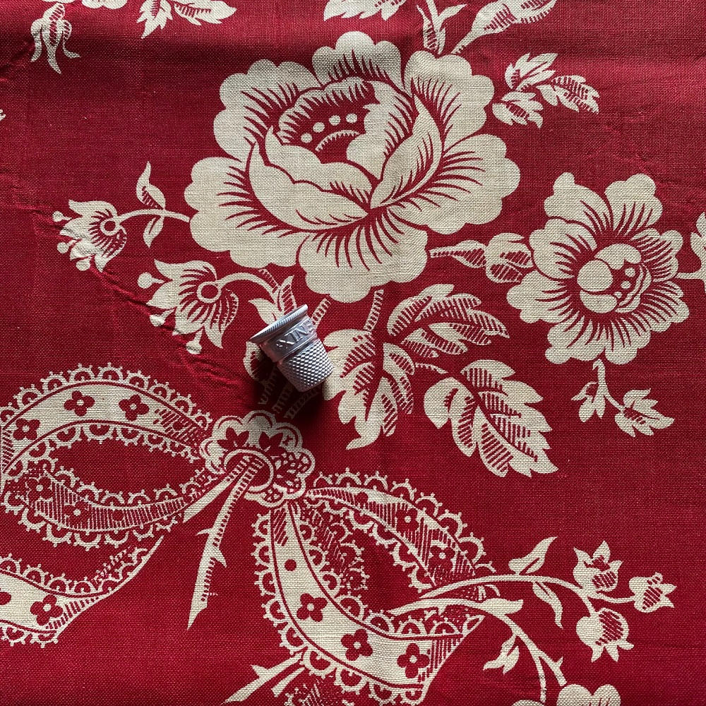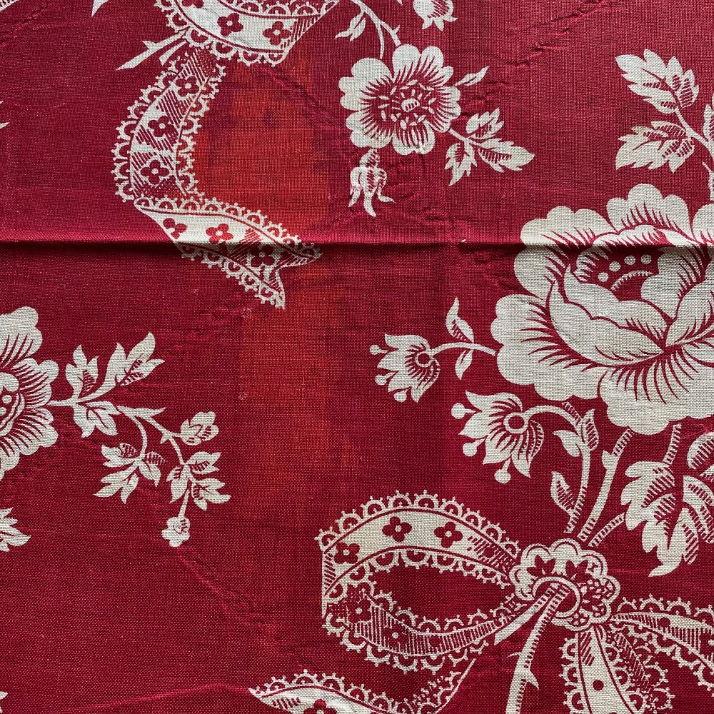 Tissu ancien, début 20ème, dépiqué d’une courtepointe, fond rouge carmin, élégantes roses nouées beige en motifs alternés.